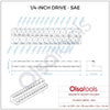 • 1/4" Drive SAE: 1/8, 5/32, 3/16, 7/32, 1/4, 9/32, 5/16, 11/32, 3/8, 7/16, 1/2, 9/16, 5/8 inch