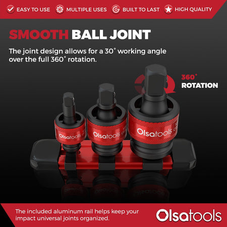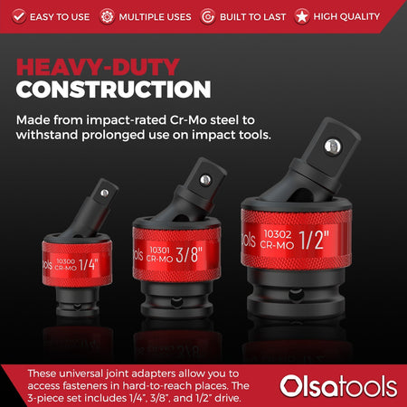 • 3pc impact u-joint socket set in 1/4", 3/8", and 1/2" drive