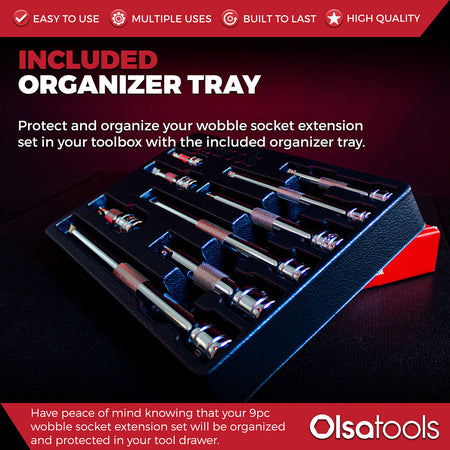 - 9 PC WOBBLE EXTENSION BAR - This wobble extension set is designed to “wobble” when in contact with the socket, providing enough flex to get into those hard-to-reach areas. Each wobble socket extension is forged from high-strength chrome-vanadium steel so they can break loose stubborn fasteners without twisting or bending.